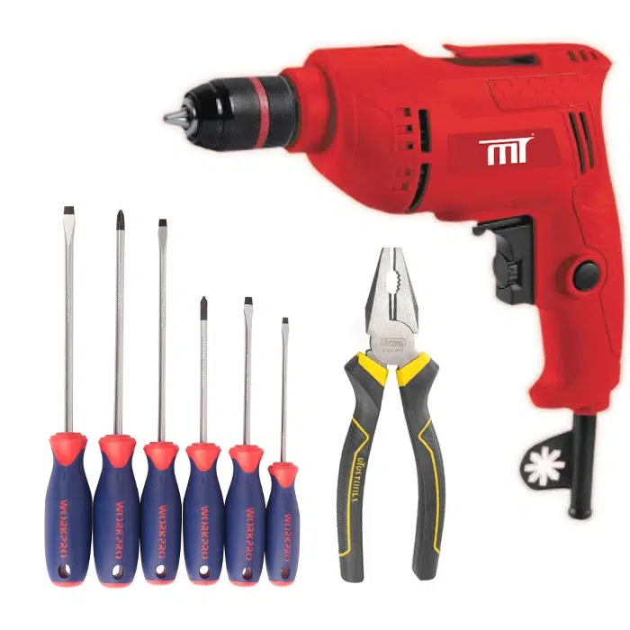 كل القطع من ماركات موثوقة، والخامات قوية. الشنيور من MT، والمفكات من WorkPro، والبنسة من اويوس يعني أدوات تعيش وتشتغل بضمير.